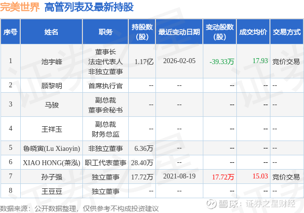 完美世界的高管列表及最新持股情况如下: