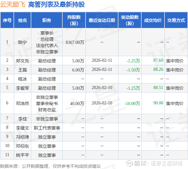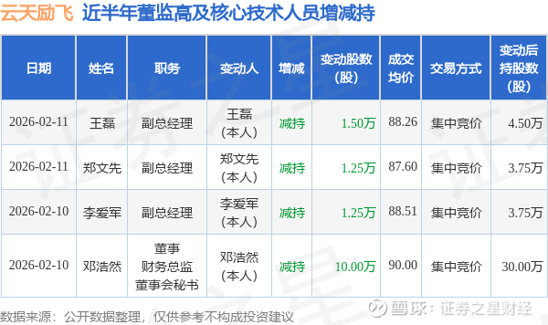 证券之星消息,根据2月11日市场公开信息、上市公司公告及交易所披露数据整理,云天励飞(688343)最新董监高及相关人员股份变动情况:2026年2月10日至2026年2月11日公司副总经理郑文先、副总经理王磊、副总经理李爱军、董事,财务总监,董事会秘书邓浩然共减持公司股份14.0万股,占公司总股本为0.039%。变动期间公司股价上涨5.59%,2月11日当日收盘报88.22元。