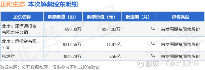 证券之星消息,根据市场公开信息整理,正和生态(605069)于2月12日将有1.28亿股限售股份解禁,为公司首发原股东限售股份,占公司总股本60.24%。(本次数据根据历史公告整理得出,实际情况以上市公司最新公告为准)本次解禁后,公司已无限售股份。具体如下图所示: