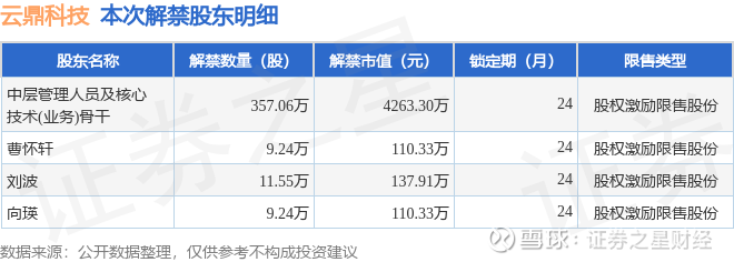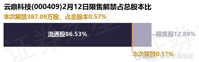 证券之星消息,根据市场公开信息整理,云鼎科技(000409)于2月12日将有387.09万股限售股份解禁,为公司股权激励限售股份,占公司总股本0.57%。(本次数据根据历史公告整理得出,实际情况以上市公司最新公告为准)最近一年内,该股累计解禁1.63亿股,占总股本的24.09%。本次解禁后,公司还有8742.27万股限售股份,占总股本12.89%。具体如下图所示: