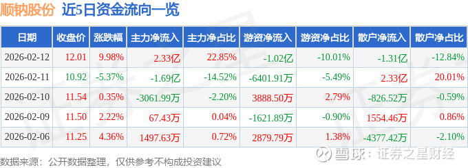 证券之星消息,顺钠股份2月12日涨停收盘,收盘价12.01元。该股于10点17分涨停,未打开涨停,截止收盘封单资金为1.82亿元,占其流通市值2.21%。