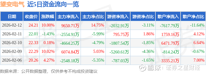 证券之星消息,望变电气2月12日涨停收盘,收盘价24.21元。该股于10点20分涨停,1次打开涨停,截止收盘封单资金为6093.9万元,占其流通市值0.76%。