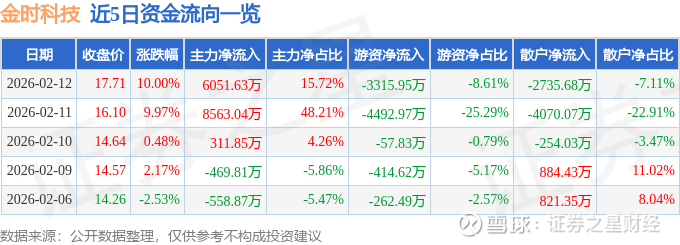 证券之星消息,金时科技2月12日涨停收盘,收盘价17.71元。该股于9点36分涨停,未打开涨停,截止收盘封单资金为1.34亿元,占其流通市值1.89%。