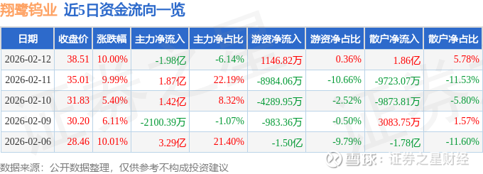 证券之星消息,翔鹭钨业2月12日涨停收盘,收盘价38.51元。该股于10点48分涨停,1次打开涨停,截止收盘封单资金为3219.25万元,占其流通市值0.31%。