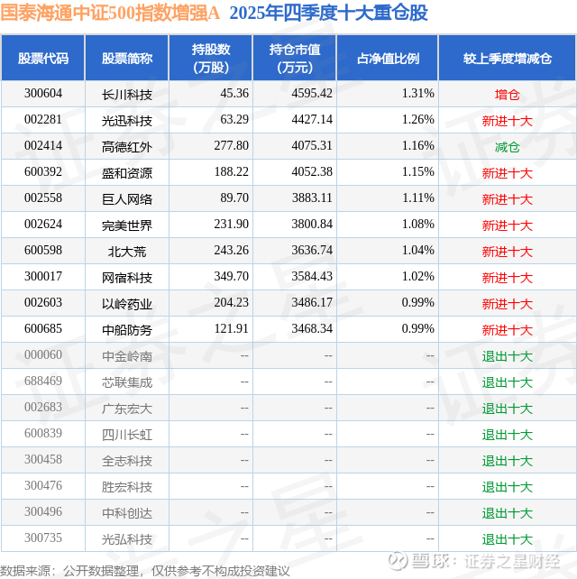 国泰海通中证500指数增强A的前十大重仓股如下: