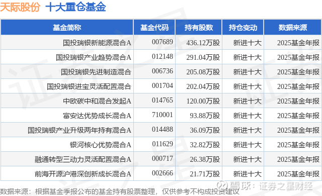 重仓天际股份的前十大公募基金请见下表: