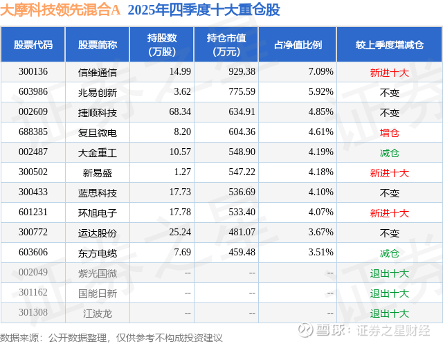 根据2025基金年报公募基金重仓股数据,重仓该股的公募基金共2家,其中持有数量最多的公募基金为摩根士丹利基金的大摩科技领先混合A。大摩科技领先混合A目前规模为1.24亿元,最新净值2.6414(2月11日),较上一交易日下跌1.16%,近一年上涨58.33%。该公募基金现任基金经理为雷志勇。雷志勇在任的基金产品包括:大摩数字经济混合A,管理时间为2023年3月2日至今,期间收益率为171.04%;大摩景气智选混合A,管理时间为2025年5月16日至今,期间收益率为45.02%;大摩港股通多元成长混合A,管理时间为2026年1月13日至今,期间收益率为-0.98%。