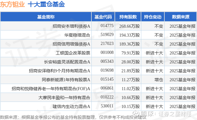 根据2025基金年报公募基金重仓股数据,重仓该股的公募基金共23家,其中持有数量最多的公募基金为招商基金的招商安本增利债券A。招商安本增利债券A目前规模为74.81亿元,最新净值1.9149(2月11日),较上一交易日上涨0.04%,近一年上涨17.26%。该公募基金现任基金经理为滕越 王娟娟。滕越在任的基金产品包括:招商信用增强债券A,管理时间为2017年7月29日至今,期间收益率为38.49%;招商民安增益债券A,管理时间为2020年3月6日至今,期间收益率为36.42%;招商安泽稳利9个月持有期混合A,管理时间为2023年11月14日至今,期间收益率为26.02%。王娟娟在任的基金产品包括:招商招悦纯债A,管理时间为2021年12月31日至今,期间收益率为16.6%;招商安华债券A,管理时间为2021年12月31日至今,期间收益率为15.7%;招商享利增强债券A,管理时间为2022年2月24日至今,期间收益率为9.4%。