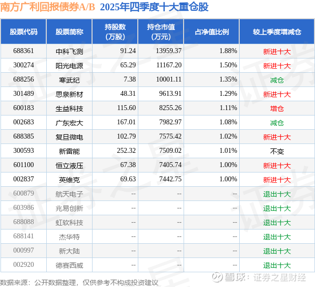根据2025基金年报公募基金重仓股数据,重仓该股的公募基金共17家,其中持有数量最多的公募基金为南方基金的南方广利回报债券A/B。南方广利回报债券A/B目前规模为62.79亿元,最新净值2.0953(2月11日),较上一交易日下跌0.21%,近一年上涨34.74%。该公募基金现任基金经理为刘文良 王润栋。刘文良在任的基金产品包括:南方希元可转债债券A,管理时间为2018年3月14日至今,期间收益率为99.12%;南方宁利一年定开债发起式,管理时间为2020年2月14日至今,期间收益率为17.49%;南方昌元可转债债券A,管理时间为2020年3月6日至今,期间收益率为119.06%。王润栋在任的基金产品包括:南方乾利定开债,管理时间为2023年2月10日至今,期间收益率为10.57%;南方耀元债券A,管理时间为2023年2月10日至今,期间收益率为7.95%;南方晨利一年定开债券发起,管理时间为2023年3月3日至今,期间收益率为9.63%;南方骏元中短期利率债债券A,管理时间为2023年5月26日至今,期间收益率为7.61%。
