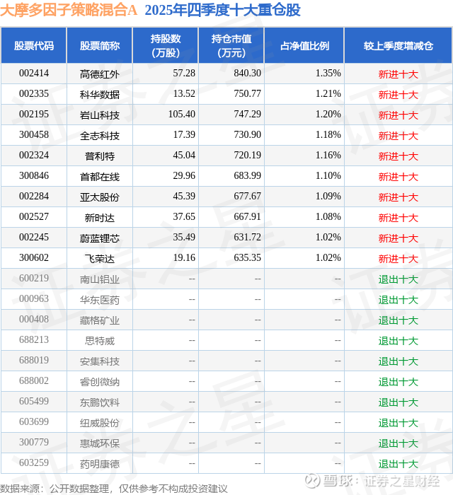 大摩多因子策略混合A的前十大重仓股如下: