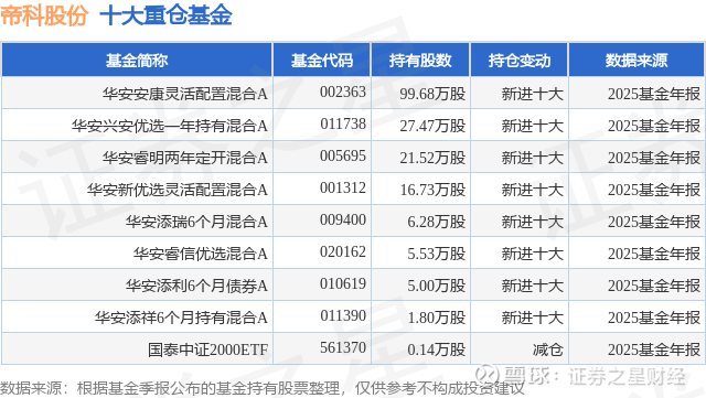 根据2025基金年报公募基金重仓股数据,重仓该股的公募基金共9家,其中持有数量最多的公募基金为华安基金的华安安康灵活配置混合A。华安安康灵活配置混合A目前规模为16.47亿元,最新净值1.9678(2月11日),较上一交易日下跌0.51%,近一年上涨11.01%。该公募基金现任基金经理为石雨欣 陆奔。石雨欣在任的基金产品包括:华安稳固收益债券A,管理时间为2016年3月22日至今,期间收益率为99.49%;华安添祥6个月持有混合A,管理时间为2021年7月23日至今,期间收益率为21.49%;华安鼎安优选一年持有混合A,管理时间为2022年6月2日至今,期间收益率为25.64%。陆奔在任的基金产品包括:华安新优选灵活配置混合A,管理时间为2020年1月23日至今,期间收益率为50.21%;华安睿明两年定开混合A,管理时间为2020年1月23日至今,期间收益率为160.25%;华安添瑞6个月混合A,管理时间为2020年6月22日至今,期间收益率为34.23%。
