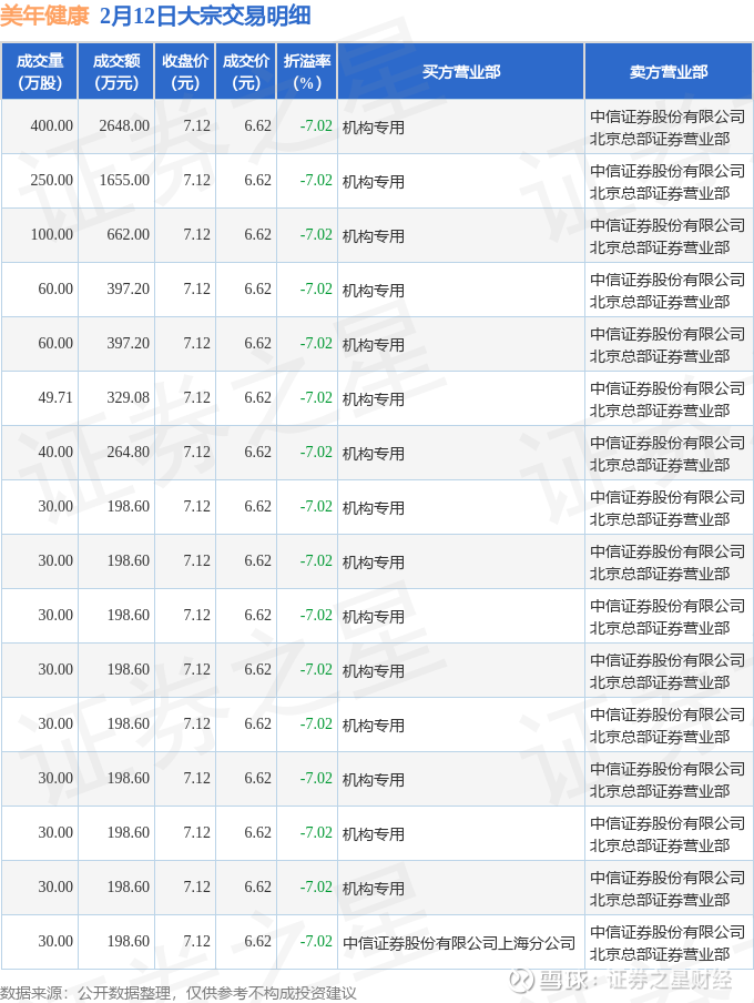 证券之星消息,2月12日美年健康发生大宗交易,交易数据如下: