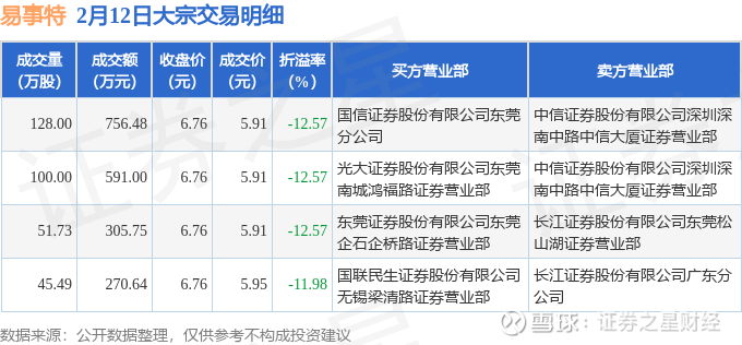 证券之星消息,2月12日易事特发生大宗交易,交易数据如下: