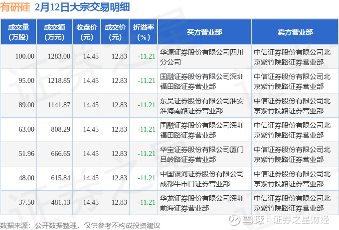 证券之星消息,2月12日有研硅发生大宗交易,交易数据如下: