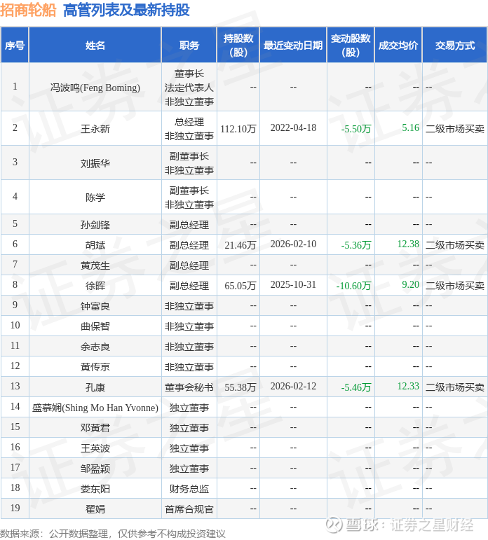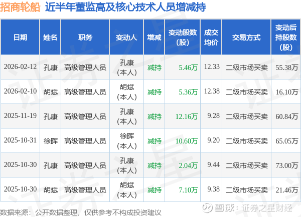 招商轮船近半年内的董监高及核心技术人员增减持详情如下: