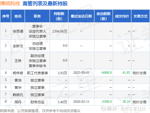 证券之星消息,根据2月12日市场公开信息、上市公司公告及交易所披露数据整理,博硕科技(300951)最新董监高及相关人员股份变动情况:2026年2月11日公司高管周丹共减持公司股份3500.0股,占公司总股本为0.0021%。变动期间公司股价上涨0.83%,2月11日当日收盘报37.7元。