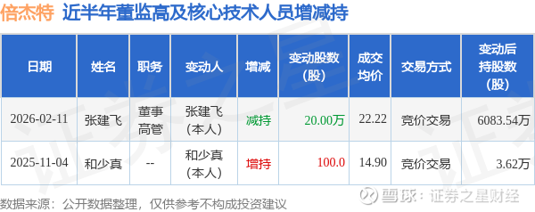 证券之星消息,根据2月12日市场公开信息、上市公司公告及交易所披露数据整理,倍杰特(300774)最新董监高及相关人员股份变动情况:2026年2月11日公司董事,高管张建飞共减持公司股份20.0万股,占公司总股本为0.0489%。变动期间公司股价上涨3.86%,2月11日当日收盘报22.05元。