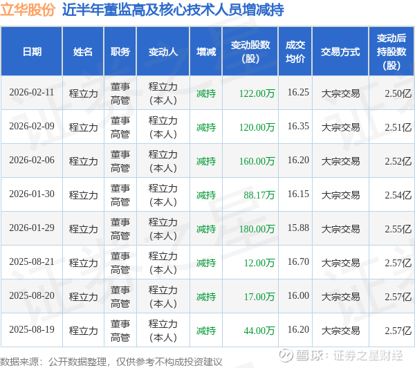 立华股份近半年内的董监高及核心技术人员增减持详情如下: