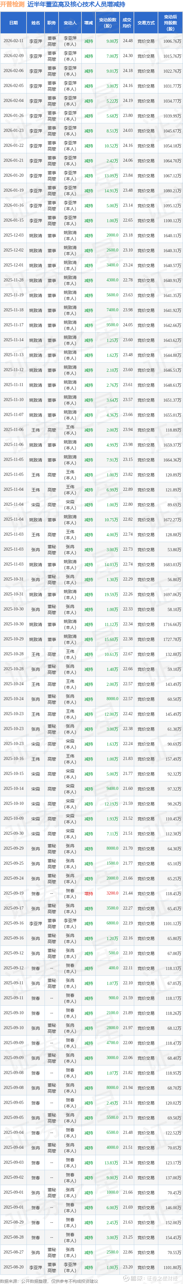 开普检测近半年内的董监高及核心技术人员增减持详情如下: