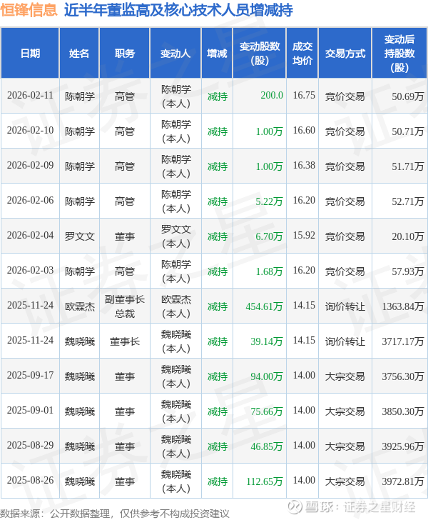 恒锋信息近半年内的董监高及核心技术人员增减持详情如下: