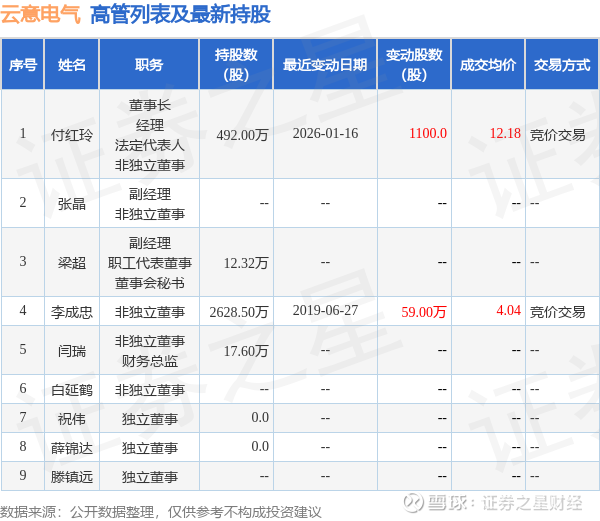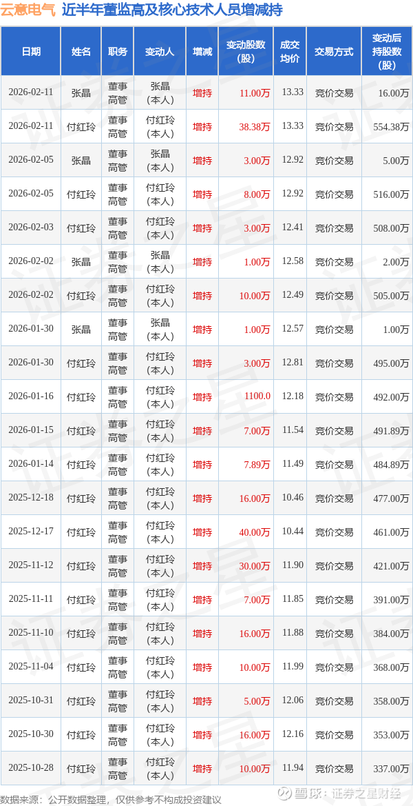 证券之星消息,根据2月12日市场公开信息、上市公司公告及交易所披露数据整理,云意电气(300304)最新董监高及相关人员股份变动情况:2026年2月11日公司董事,高管付红玲、董事,高管张晶共增持公司股份49.38万股,占公司总股本为0.0562%。变动期间公司股价下跌1.34%,2月11日当日收盘报13.21元。
