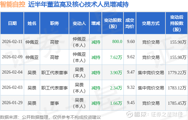 智能自控近半年内的董监高及核心技术人员增减持详情如下:
