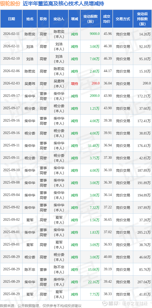 银轮股份近半年内的董监高及核心技术人员增减持详情如下: