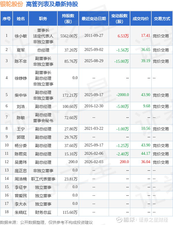 证券之星消息,根据2月12日市场公开信息、上市公司公告及交易所披露数据整理,银轮股份(002126)最新董监高及相关人员股份变动情况:2026年2月11日公司高管刘浩、高管陈君奕共减持公司股份3.9万股,占公司总股本为0.0046%。变动期间公司股价下跌1.71%,2月11日当日收盘报45.96元。