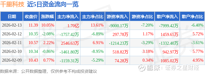 证券之星消息,千里科技2月13日涨停收盘,收盘价11.39元。该股于11点10分涨停,1次打开涨停,截止收盘封单资金为5721.98万元,占其流通市值0.11%。