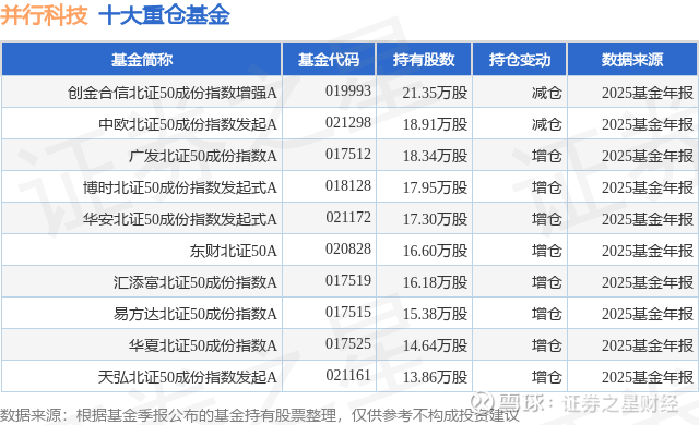 根据2025基金年报公募基金重仓股数据,重仓该股的公募基金共32家,其中持有数量最多的公募基金为创金合信基金的创金合信北证50成份指数增强A。创金合信北证50成份指数增强A目前规模为2.47亿元,最新净值1.6499(2月12日),较上一交易日上涨0.5%,近一年上涨16.58%。该公募基金现任基金经理为董梁 黄小虎。董梁在任的基金产品包括:创金合信沪深300指数增强A,管理时间为2018年11月19日至今,期间收益率为99.21%;创金合信量化多因子股票A,管理时间为2019年7月5日至今,期间收益率为138.64%;创金合信中证500指数增强A,管理时间为2019年7月5日至今,期间收益率为111.59%;创金合信中证1000指数增强A,管理时间为2019年7月5日至今,期间收益率为135.88%。黄小虎在任的基金产品包括:创金合信量化多因子股票A,管理时间为2022年7月29日至今,期间收益率为31.24%;创金合信量化发现混合A,管理时间为2025年11月19日至今,期间收益率为9.51%;创金合信怡久回报债券A,管理时间为2026年1月16日至今,期间收益率为-0.06%。