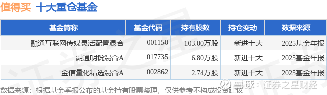 根据2025基金年报公募基金重仓股数据,重仓该股的公募基金共3家,其中持有数量最多的公募基金为融通基金的融通互联网传媒灵活配置混合。融通互联网传媒灵活配置混合目前规模为8.4亿元,最新净值1.309(2月12日),较上一交易日上涨0.93%,近一年上涨55.65%。该公募基金现任基金经理为张鹏。张鹏在任的基金产品包括:融通明锐混合A,管理时间为2025年2月21日至今,期间收益率为64.73%。