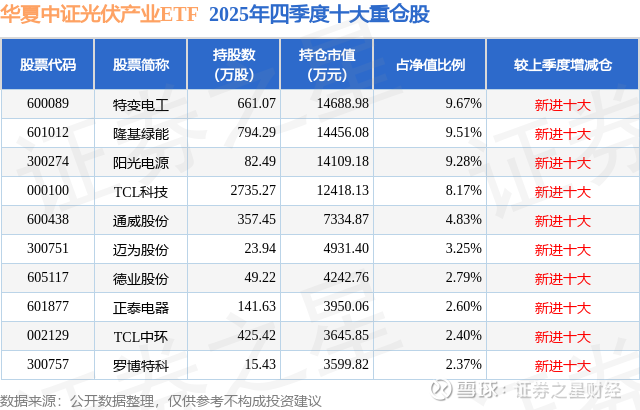 根据2025基金年报公募基金重仓股数据,重仓该股的公募基金共6家,其中持有数量最多的公募基金为华夏基金的华夏中证光伏产业ETF。华夏中证光伏产业ETF目前规模为15.2亿元,最新净值1.0715(2月12日),较上一交易日上涨1.23%。该公募基金现任基金经理为李俊。李俊在任的基金产品包括:华夏中证5G通信主题ETF,管理时间为2019年9月17日至今,期间收益率为130.25%;华夏中证银行ETF,管理时间为2019年10月24日至今,期间收益率为69.06%;华夏中证银行ETF联接A,管理时间为2019年12月6日至今,期间收益率为59.14%;华夏中证人工智能主题ETF,管理时间为2019年12月9日至今,期间收益率为99.16%。