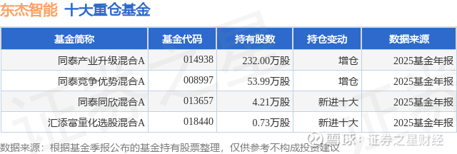 重仓东杰智能的公募基金请见下表: