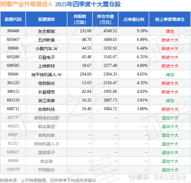 同泰产业升级混合A的前十大重仓股如下: