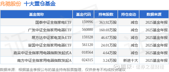 根据2025基金年报公募基金重仓股数据,重仓该股的公募基金共6家,其中持有数量最多的公募基金为国泰基金的国泰中证全指家电ETF。国泰中证全指家电ETF目前规模为14.51亿元,最新净值1.5884(2月12日),较上一交易日上涨0.08%,近一年上涨13.93%。该公募基金现任基金经理为苗梦羽。苗梦羽在任的基金产品包括:国泰中证全指软件ETF联接A,管理时间为2021年9月28日至今,期间收益率为-2.93%;国泰中证全指软件ETF,管理时间为2021年9月28日至今,期间收益率为-3.31%;国泰中证基建ETF,管理时间为2022年2月9日至今,期间收益率为10.55%;国泰中证港股通科技ETF发起联接A,管理时间为2022年6月7日至今,期间收益率为20.55%。