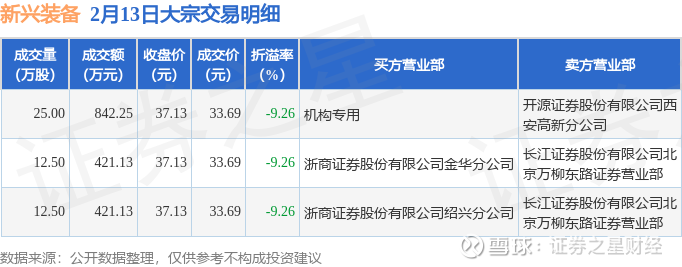 证券之星消息,2月13日新兴装备发生大宗交易,交易数据如下: