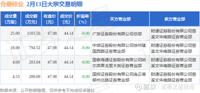 证券之星消息,2月13日合盛硅业发生大宗交易,交易数据如下: