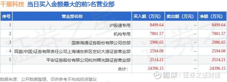 证券小知识:龙虎榜是交易所披露的竞价交易公开信息,现身龙虎榜的个股都是当日最为活跃的个股,是投资者日常重点关注的数据。交易所公布当日买入金额和卖出金额前五名的席位,其中一些席位代表特殊意义,如机构专用席位是指基金专用席位、券商自营专用席位、社保专用席位、券商理财专用席位、保险机构专用席位、保险机构租用席位、QFII专用席位等机构投资者买卖证券的专用通道和席位。深股通专用、沪股通专用为北向资金的交易席位。