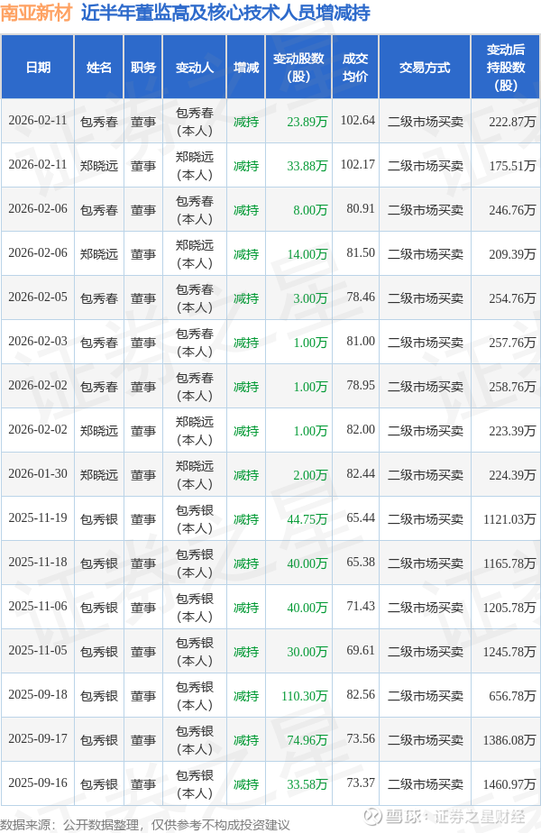 证券之星消息,根据2月13日市场公开信息、上市公司公告及交易所披露数据整理,南亚新材(688519)最新董监高及相关人员股份变动情况:2026年2月11日公司董事郑晓远、董事包秀春共减持公司股份57.77万股,占公司总股本为0.2461%。变动期间公司股价上涨9.05%,2月11日当日收盘报105.78元。