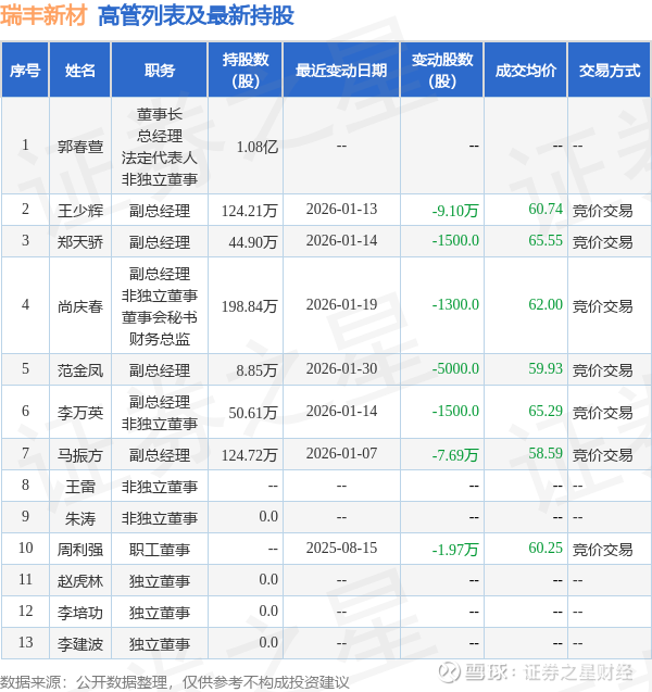 瑞丰新材的高管列表及最新持股情况如下: