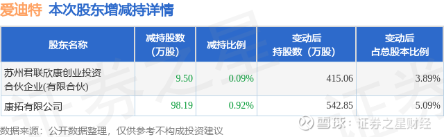 证券之星消息,2月13日爱迪特发布公告《爱迪特:关于合计持股5%以上股东权益变动触及1%刻度的公告》,其股东苏州君联欣康创业投资合伙企业(有限合伙)、康拓有限公司于2026年2月10日至2026年2月12日间合计减持107.69万股,占公司目前总股本的1.0106%,变动期间该股股价上涨23.47%,截止2月12日收盘报63.7元。
