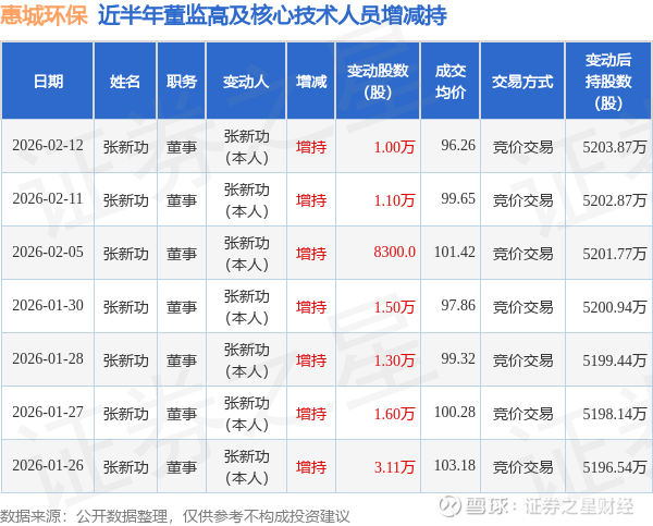 证券之星消息,根据2月13日市场公开信息、上市公司公告及交易所披露数据整理,惠城环保(300779)最新董监高及相关人员股份变动情况:2026年2月12日公司董事张新功共增持公司股份1.0万股,占公司总股本为0.005%。变动期间公司股价下跌2.96%,2月12日当日收盘报96.71元。