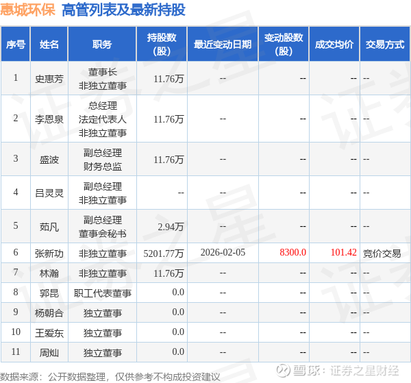 惠城环保近半年内的董监高及核心技术人员增减持详情如下: