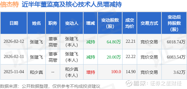 证券之星消息,根据2月13日市场公开信息、上市公司公告及交易所披露数据整理,倍杰特(300774)最新董监高及相关人员股份变动情况:2026年2月12日公司董事,高管张建飞共减持公司股份64.8万股,占公司总股本为0.1585%。变动期间公司股价上涨0.5%,2月12日当日收盘报22.16元。