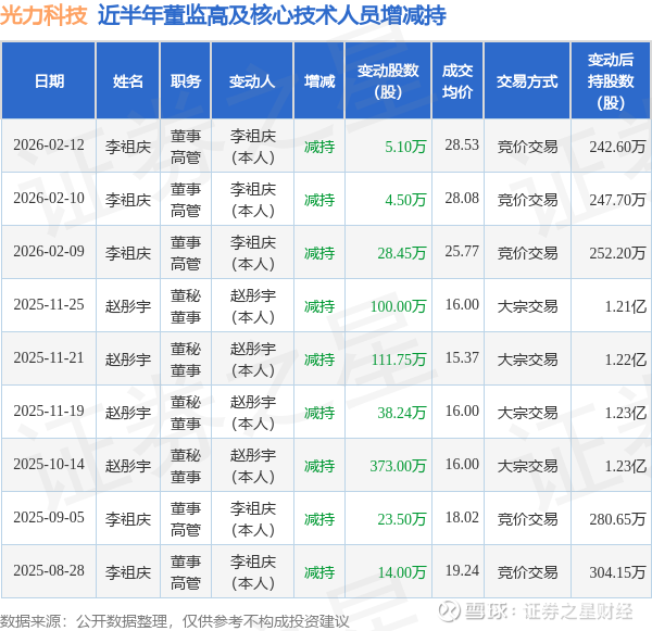 证券之星消息,根据2月13日市场公开信息、上市公司公告及交易所披露数据整理,光力科技(300480)最新董监高及相关人员股份变动情况:2026年2月12日公司董事,高管李祖庆共减持公司股份5.1万股,占公司总股本为0.0145%。变动期间公司股价上涨2.06%,2月12日当日收盘报28.23元。
