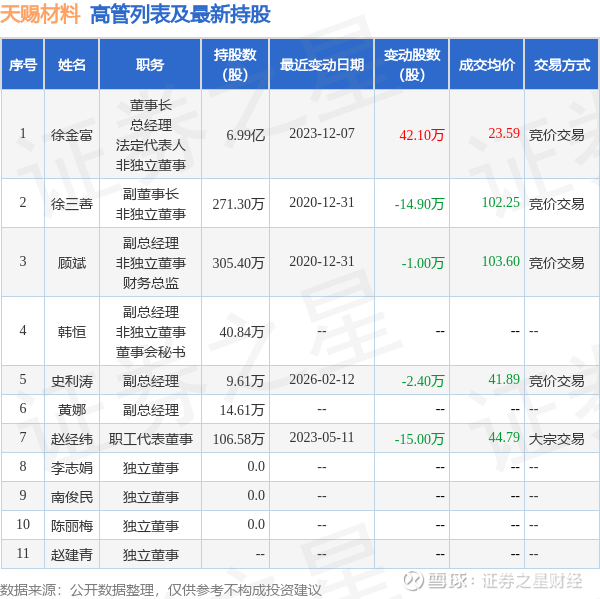 天赐材料的高管列表及最新持股情况如下: