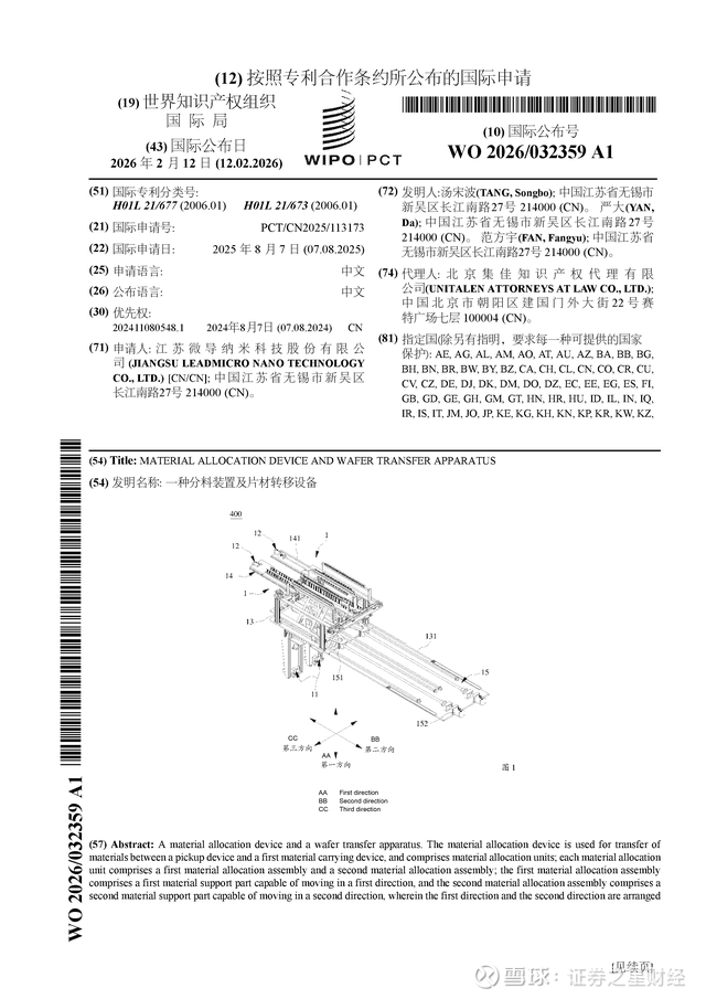 证券之星消息,根据企查查数据显示微导纳米(688147)公布了一项国际专利申请,专利名为“一种分料装置及片材转移设备”,专利申请号为PCT/CN2025/113173,国际公布日为2026年2月12日。