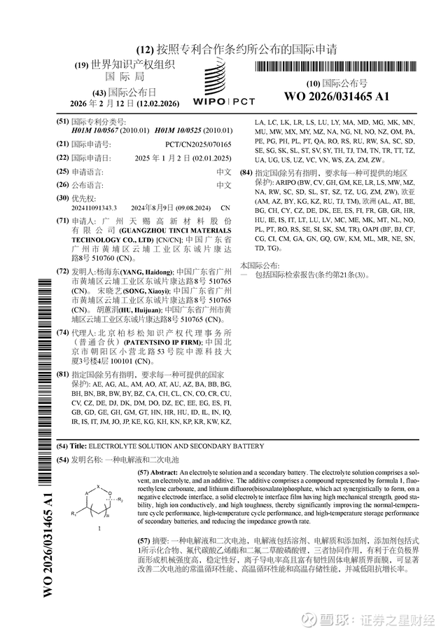证券之星消息,根据企查查数据显示天赐材料(002709)公布了一项国际专利申请,专利名为“一种电解液和二次电池”,专利申请号为PCT/CN2025/070165,国际公布日为2026年2月12日。