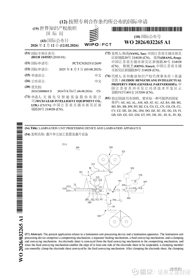 证券之星消息,根据企查查数据显示先导智能(300450)公布了一项国际专利申请,专利名为“叠片单元加工装置及叠片设备”,专利申请号为PCT/CN2025/112699,国际公布日为2026年2月12日。