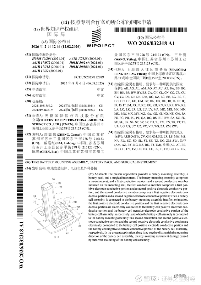 证券之星消息,根据企查查数据显示天臣医疗(688013)公布了一项国际专利申请,专利名为“电池安装组件、电池包及外科器械”,专利申请号为PCT/CN2025/112889,国际公布日为2026年2月12日。